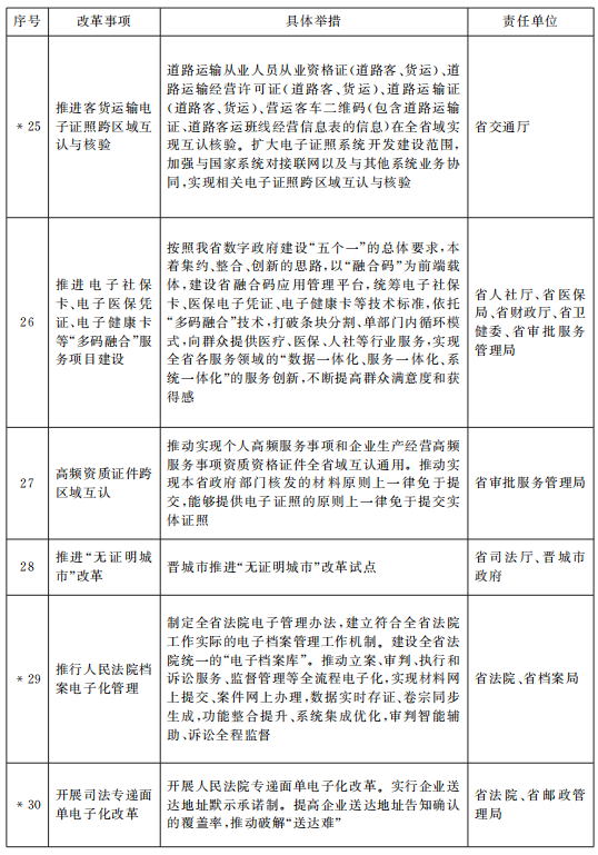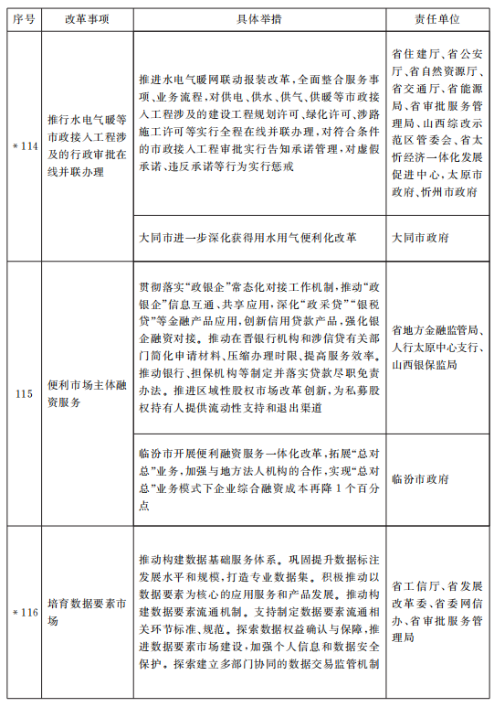 29.优化市政公用设施接入服务。推进水电气暖网联动报装改革,全面整合服务事项、业务流程,统一入驻政务大厅专窗和“三晋通”App专栏。对接入工程涉及的建设工程规划许可、绿化许可、涉路施工许可等实行全程在线并联办理,对符合条件的实行告知承诺管理,对虚假承诺、违反承诺等行为实行惩戒。