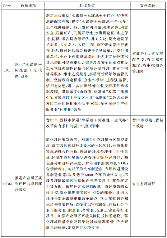 27.深化“承诺制+标准地+全代办”改革。2022年底前,制定出台推动“承诺制+标准地+全代办”改革尽快落地的配套办法。坚持政府定标准、企业作承诺、过程强监管、信用有奖惩,进一步拓展延伸企业投资项目承诺制范围。落实《山西省“标准地”改革工作指引》,省级及以上开发区出让“标准地”宗数占本开发区工业用地比重不低于80%,探索推进生产性服务业“标准地”改革。深化“多规合一”、“多测合一”、联合验收改革,推进涉审中介服务事项改革,建立项目前期服务机制,量身订制“一项目一方案一清单”审批服务。制定出台优化小型社会投资简易低风险项目审批服务制度,推动“成交即发证”“交地即开工”“竣工即登记”。