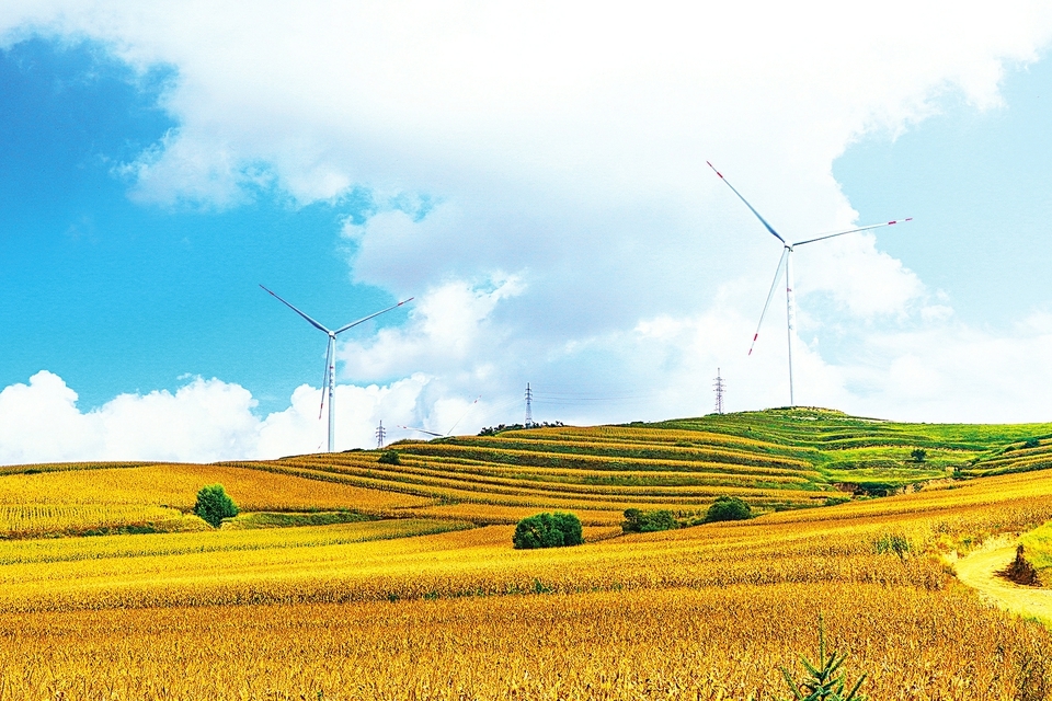 9月26日,神池县山野染上金黄,巨型风力发电机叶片在微风中缓缓转动,与周围的自然景观完美地融合在一起,绘就一幅清洁能源助力乡村振兴的美丽画卷。山西日报记者申晋光摄